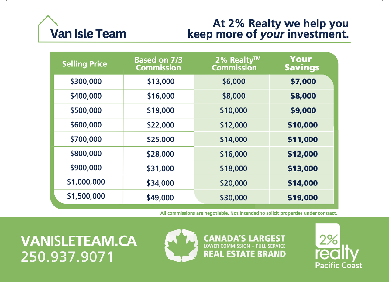 The Van Isle Team at 2% Realty Pacific Coast is here to guide and support you every step of the way on your real estate journey. With our focus on your needs, transparent service, and a reasonable 2% commission, we help you keep more of your investment! Now offering Realtor© services in the Parksville, Qualicum Beach and Nanaimo region.