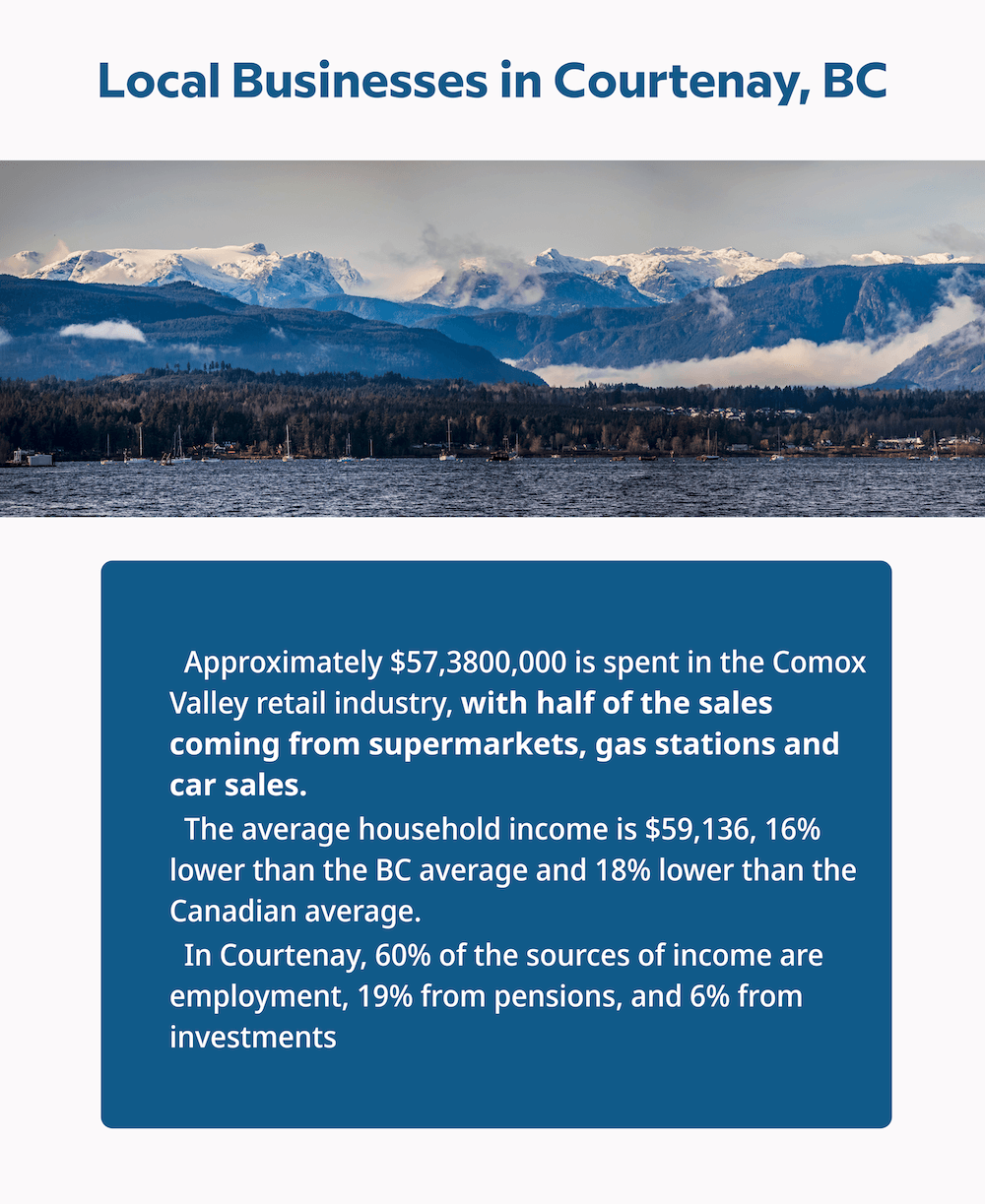 Approximately $57,3800,000 is spent in the Comox Valley retail industry, with half of the sales coming from supermarkets, gas stations and car sales. The average household income is $59,136, 16% lower than the BC average and 18% lower than the Canadian average. In Courtenay, 60% of the sources of income are employment, 19% from pensions, and 6% from investments.